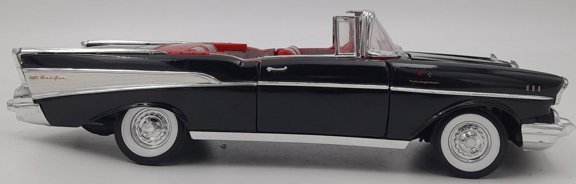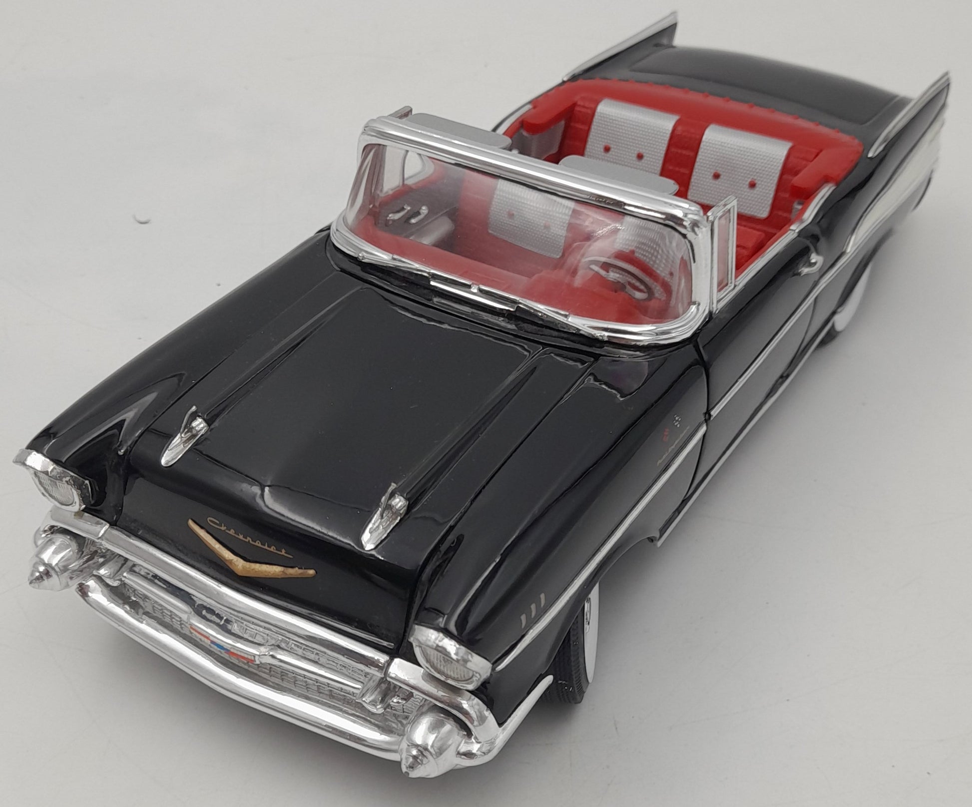 Grande miniature à l’échelle 1/18 avec très beaux détails : carrosserie noire brillante, intérieur rouge bicolore, nombreux chromes, jantes blanches, logos Chevrolet, tableau de bord détaillé et finition réaliste.