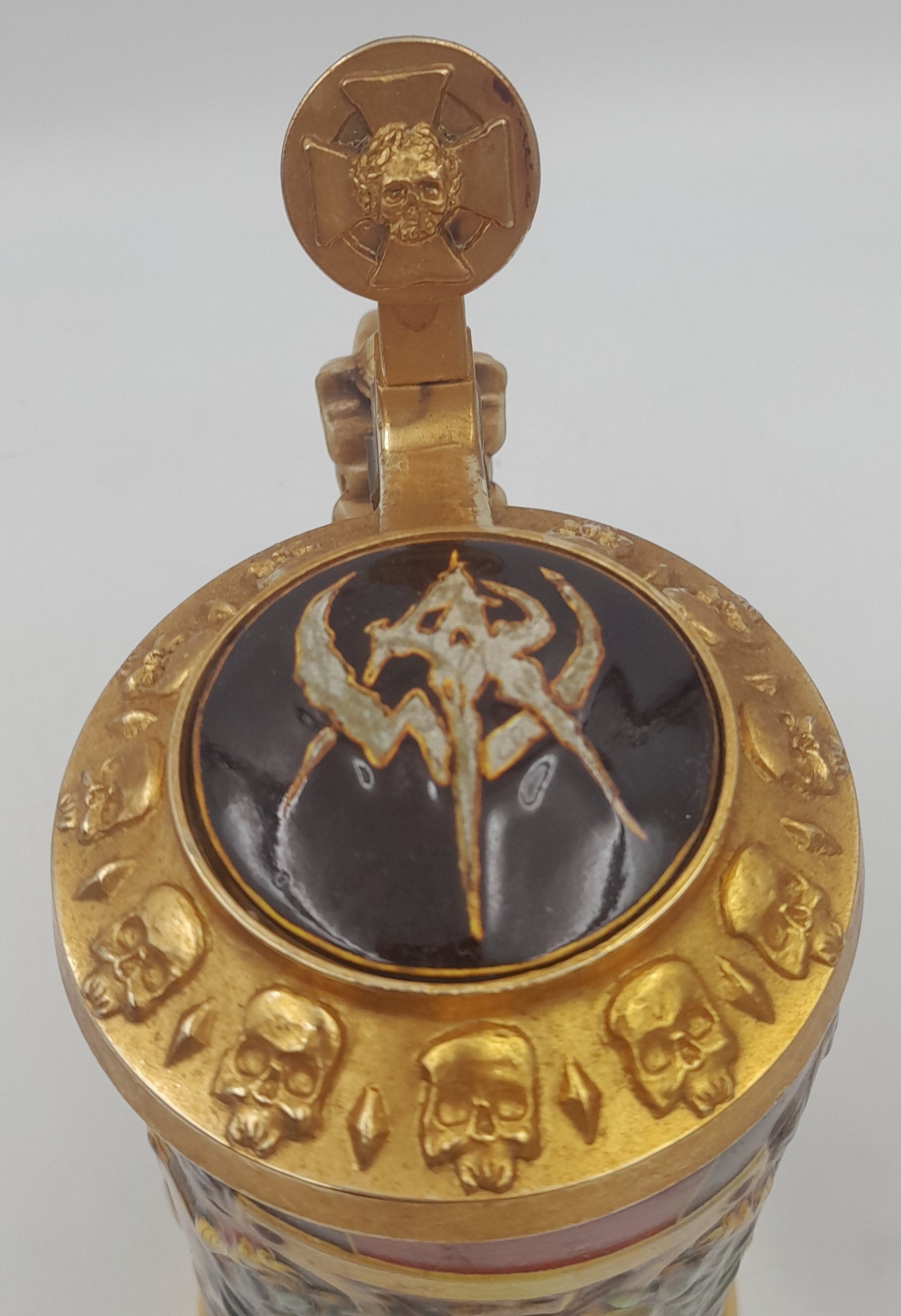 Cette chope de collection officielle Warhammer Online: Age of Reckoning de 2010 rend hommage à l’Ordre du Griffon, l’une des factions iconiques de l’univers Warhammer Fantasy. Entièrement sculptée et peinte avec des détails impressionnants, elle met en scène symboles impériaux, crânes, griffons et armes emblématiques, avec un couvercle ouvrant décoré du sceau de l’Ordre.